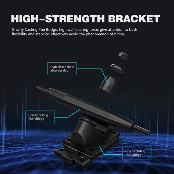 ④Double shock absorption. Two pairs of shock absorbers are mounted on the skateboard for better shock absorption and more cushing and sliding. It will fully reflect the stability of the sliding jump; This makes it easy to handle a variety of rough roads.