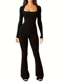 LONG SLEEVE SQUARE NECK FLARE JUMPSUIT (Color: BLACK, size: XL)