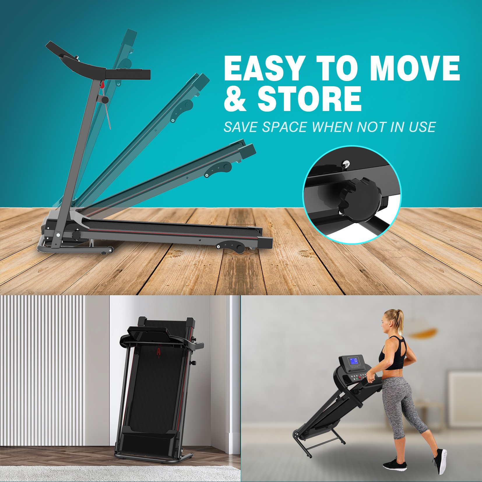 2.FOLDABLE DESIGN: With compact assembled dimensions of 51.2" x 46.5" x 25.6"" and Folded dimensions of 23.4" x 25.6" x 49.2", our Foldable Treadmill is perfect for small spaces. You can fold it and store it easily when not in use.